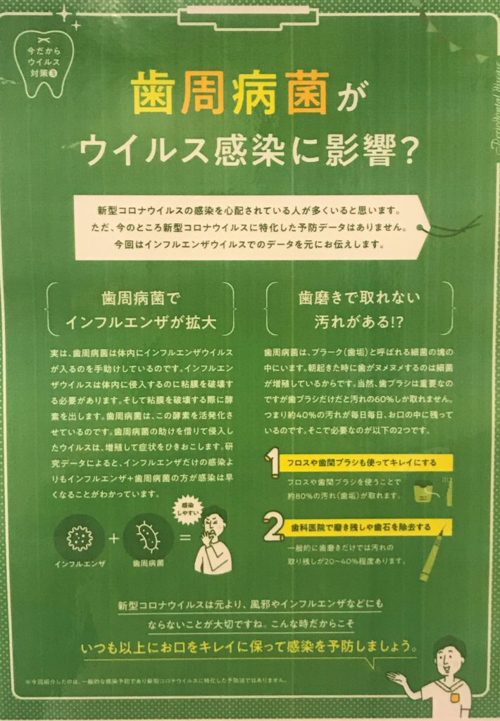 BLOG ブログ HOMEブログ新着情報〈歯周病菌がウイルス感染に影響?〉 2020.09.01 お知らせ ブログ 新着情報 〈歯周病菌がウイルス感染に影響?〉 上記のようにお口の中を清潔にすることは風邪予防、インフルエンザ予防にも つながります。 ご自宅で、フロスや歯ブラシを使って約80%の汚れ(歯垢)がとれますが、 残りの20~40%の汚れは残ってしまいます。歯磨きではとりきれない汚れは 歯科医院でしっかりとって、お口の中から健康になりましょう。 2020年今年は特に体調管理が大切ですね 沢山の方々が健康に過ごせますように! 前の記事へ 記事一覧 次の記事へ