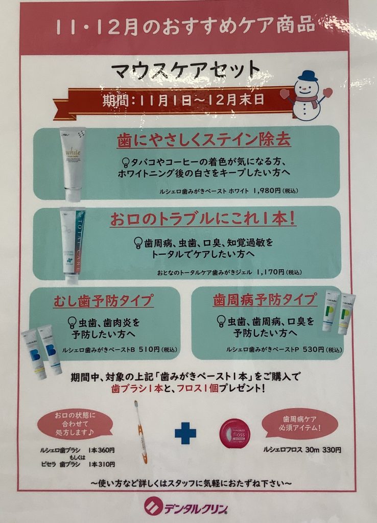 BLOG ブログ HOMEブログ新着情報マウスケアセット! 2021.11.27 お知らせ ブログ 新着情報 マウスケアセット! 1番人気のセットは トータルケア歯磨きジェル+ピセラ歯ブラシ+ルシェロフロスのセットです! 新年を新しい歯ブラシセットで迎えたいと準備される方も多いようですね お口の状態に合わせて処方致しますのでご相談ください 前の記事へ 記事一覧 次の記事へ